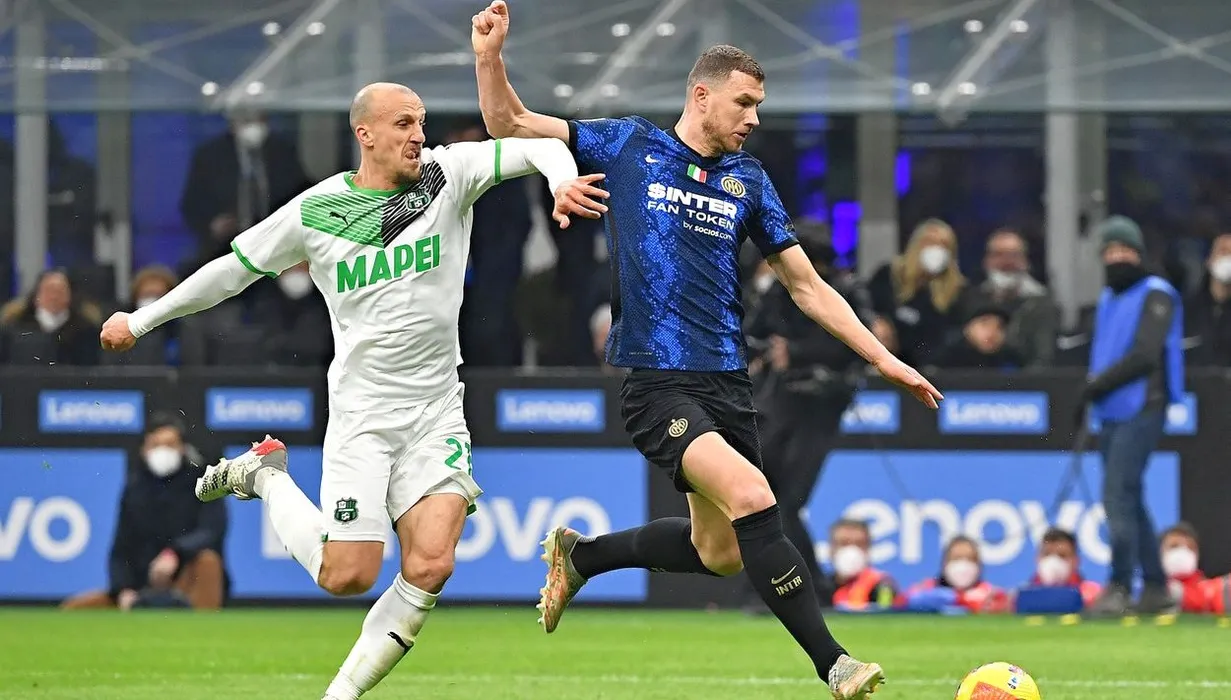 Inter Milan's Bosnian forward Edin Dzeko (R) fights for the ball with Sassuolo's Romanian defender Vlad Chiriches during the Italian Serie A football match Inter Milan vs Sassuolo at the San Siro stadium in Milan, on February 20, 2022.,Image: 663835694, License: Rights-managed, Restrictions: , Model Release: no, Credit line: Profimedia