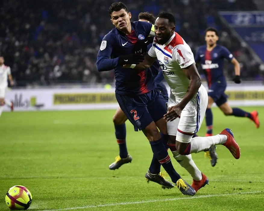 Paris Saint-Germain's Brazilian defender Thiago Silva (L) makes a fault on Lyon's French forward Moussa Dembele (R) leading the referee to call for a penalty during the French L1 football match between Olympique Lyonnais (OL) and Paris-Saint Germain (PSG) at Groupama stadium in Decines-Charpieu, near Lyon, on February 3, 2019., Image: 411950737, License: Rights-managed, Restrictions: , Model Release: no, Credit line: JEFF PACHOUD / AFP / Profimedia