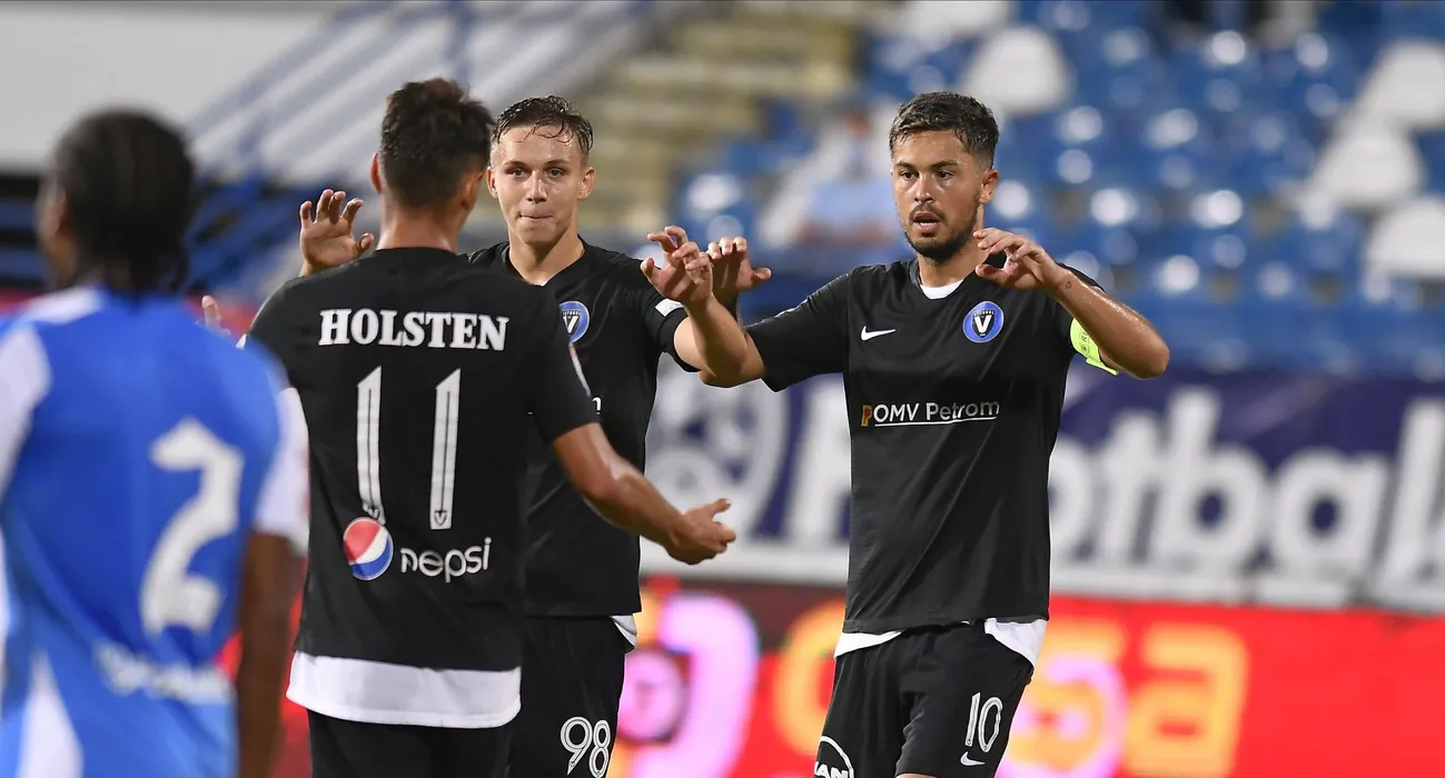 Gabriel Cristian Iancu se bucura alaturi de Louis Munteanu dupa un gol marcat in meciul de fotbal dintre CSM Politehnica Iasi si FC Viitorul Constanta, contand pentru play-off-ul Ligii 1 Casa Pariurilor, disputat fara spectatori pe Stadionul Emil Alexandrescu din Iasi, luni 20 iulie 2020. © FOTO:Razvan Pasarica/SPORT PICTURES