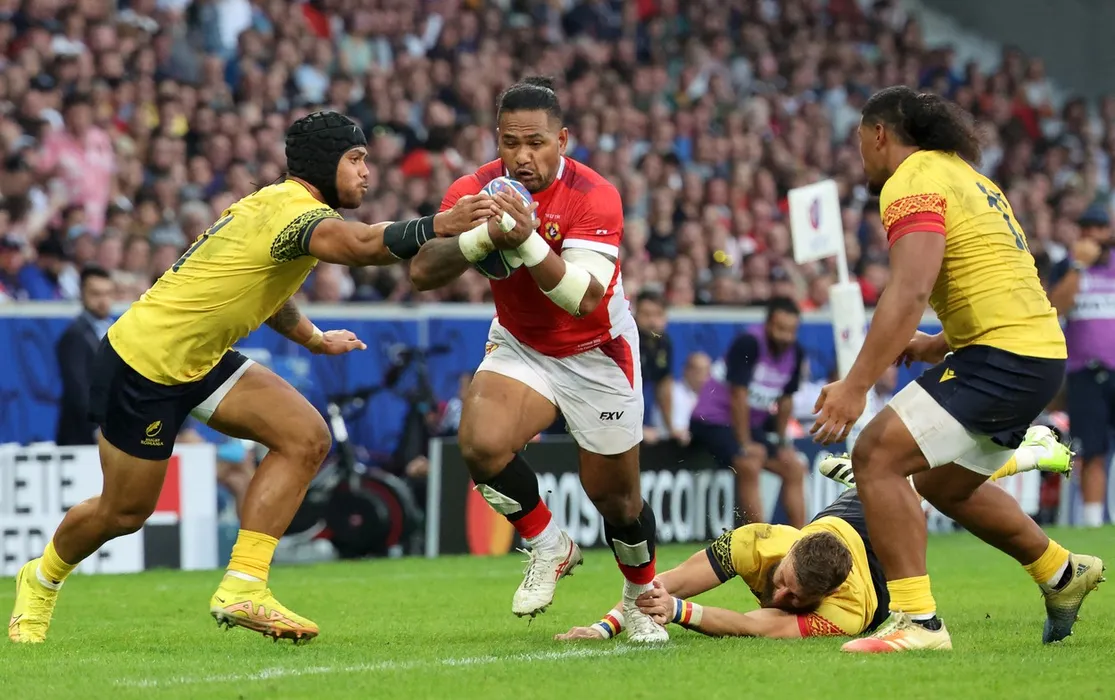 Tonga's right wing Solomone Kata attempts to break away from Romania's left wing Taliauli Sikuea (L) during the France 2023 Rugby World Cup Pool B match between Tonga and Romania at the Stade Pierre-Mauroy in Villeneuve-d'Ascq, near Lille, northern France on October 8, 2023.,Image: 812027358, License: Rights-managed, Restrictions: , Model Release: no