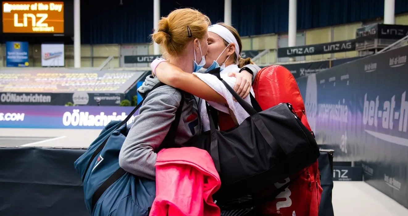 Greet Minnen of Belgium celebrates winning her first round match with her girlfriend Alison van Uytvanck at the 2020 Upper Austria Ladies Linz WTA International tennis tournament