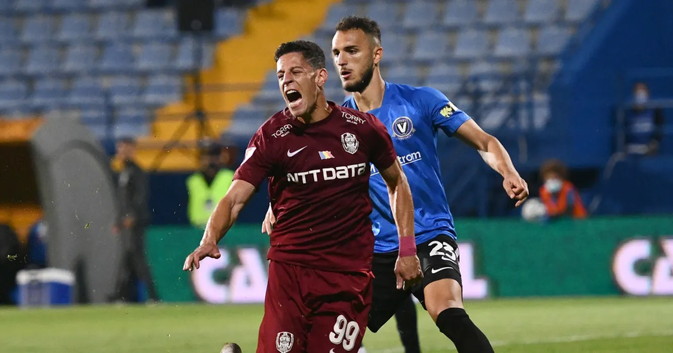 Virgil Eugen Ghita il faulteaza in careu pe Mario Junior Rondon Fernandez in meciul de fotbal dintre FC Viitorul Constanta si CFR Cluj, contand pentru Liga 1 Casa Pariurilor, desfasurat fara spectatori pe Stadionul Central al Academiei Gheorghe Hagi din Ovidiu, duminica 4 octombrie 2020. © FOTO:Razvan Pasarica/SPORT PICTURES