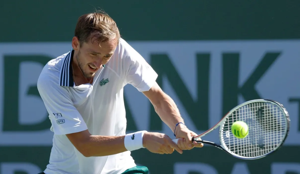 Daniil Medvedev of Russia returns a shot to Grigor Dimitrov of Bulgaria during the BNP Paribas Open at Indian Wells Tennis Garden in Indian Wells, California. Mandatory Photo Credit : Charles Baus/CSM