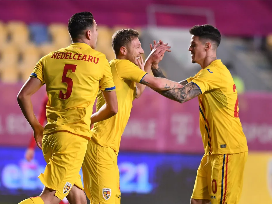 Bogdan Mitrea se bucura alaturi de Ionut Neldecearu si Dennis Man dupa un gol marcat in meciul de fotbal dintre Romania si Belarus, contand pentru Liga Natiunilor, desfasurat fara spectatori pe Stadionul Ilie Oana din Ploiesti, miercuri 11 noiembrie 2020. © FOTO:Razvan Pasarica/SPORT PICTURES