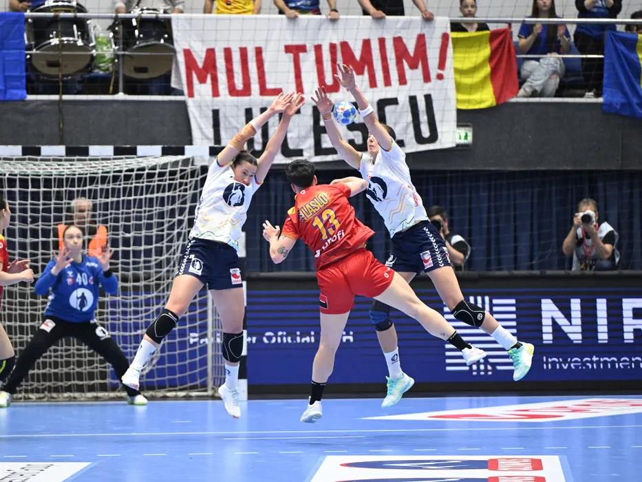 Cristina Laslo alaturi de un baner afisat in peluza pe care sta scris:"Multumim, Lucescu!" in meciul de handbal feminin dintre Romania si Norvegia, din cadrul EHF Euro Cup 2026, desfasurat in Sala Polivalenta Ioan Kunst Ghermanescu din Bucuresti, miercuri 8 aprilie 2026. © FOTO:Razvan Pasarica/SPORT PICTURES