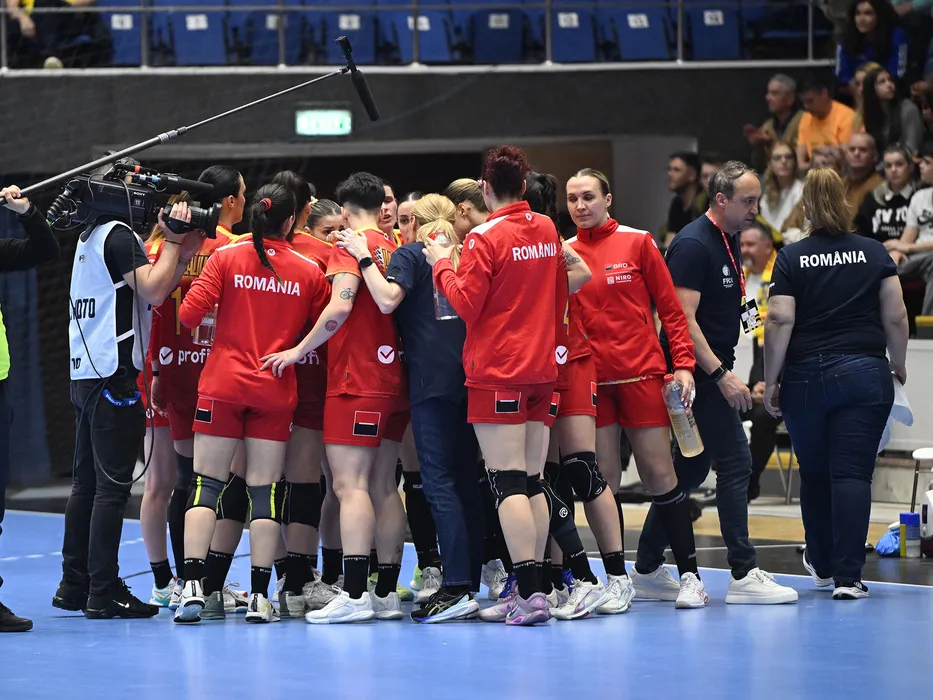 Handbalistele romance la un timeout alaturi de antrenorul lor Ovidiu Mihai Mihaila in meciul de handbal feminin dintre Romania si Norvegia, din cadrul EHF Euro Cup 2026, desfasurat in Sala Polivalenta Ioan Kunst Ghermanescu din Bucuresti, miercuri 8 aprilie 2026. © FOTO:Razvan Pasarica/SPORT PICTURES