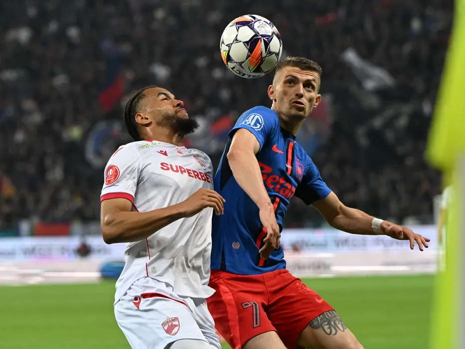 Maxime James Sivis si Florin Lucian Tănase in meciul de fotbal dintre FCSB si Dinamo Bucuresti, din cadrul Play off-ului Superligii Superbet, desfasurat pe Arena Nationala din Bucuresti, luni 5 mai 2025. © FOTO:Razvan Pasarica/SPORT PICTURES