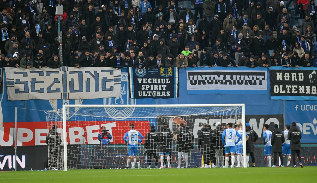 Fotbaliștii craioveni salută galeria după meciul de fotbal dintre Universitatea Craiova si FCSB, contând pentru Superliga Superbet, desfășurat pe Stadionul Ion Oblemenco din Craiova, duminica 28 ianuarie 2024. © FOTO: Răzvan PĂSĂRICĂ/SPORT PICTURES