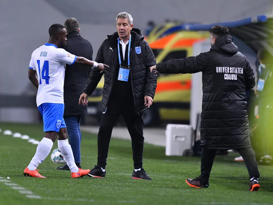 Reagy Ofosu si Cristiano Bergodi in meciul de fotbal dintre Universitatea Craiova si Chindia Targoviste, contand pentru Liga 1 Casa Pariurilor, desfasurat fara spectatori pe Stadionul Ion Oblemenco din Craiova, vineri 6 noiembrie 2020. © FOTO:Razvan Pasarica/SPORT PICTURES