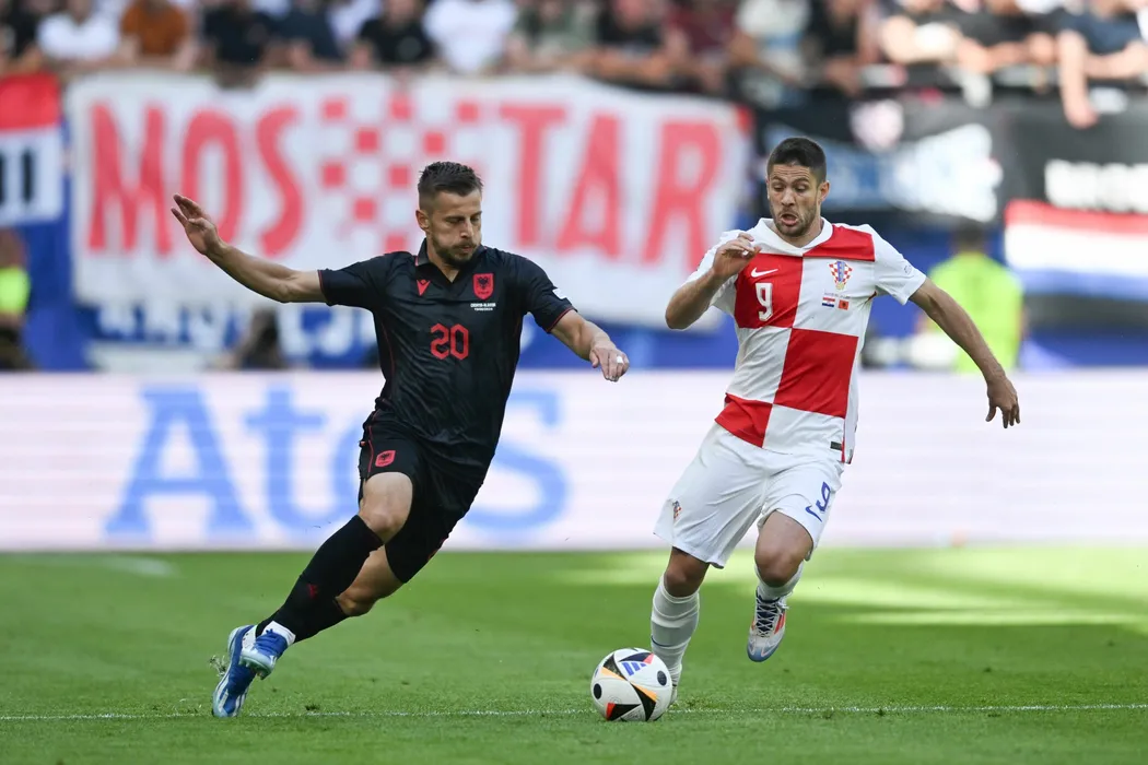 19 June 2024, Hamburg: Albania's Ylber Ramadani (L) and Croatia's Andrej Kramaric battle for the ball during the UEFA Euro 2024 group B soccer match between Croatia and Albania at Volksparkstadion Hamburg. Photo: Sina Schuldt/dpa