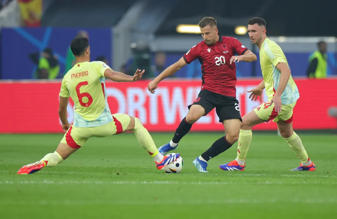 24 June 2024, North Rhine-Westphalia, Duesseldorf: Albania's Ylber Ramadani (C) battles for the ball with Spain's Mikel Merino (L) and Aymeric Laporte during the UEFA Euro 2024 group B soccer match between Albania and Spain at Duesseldorf Arena. Photo: Rolf Vennenbernd/dpa