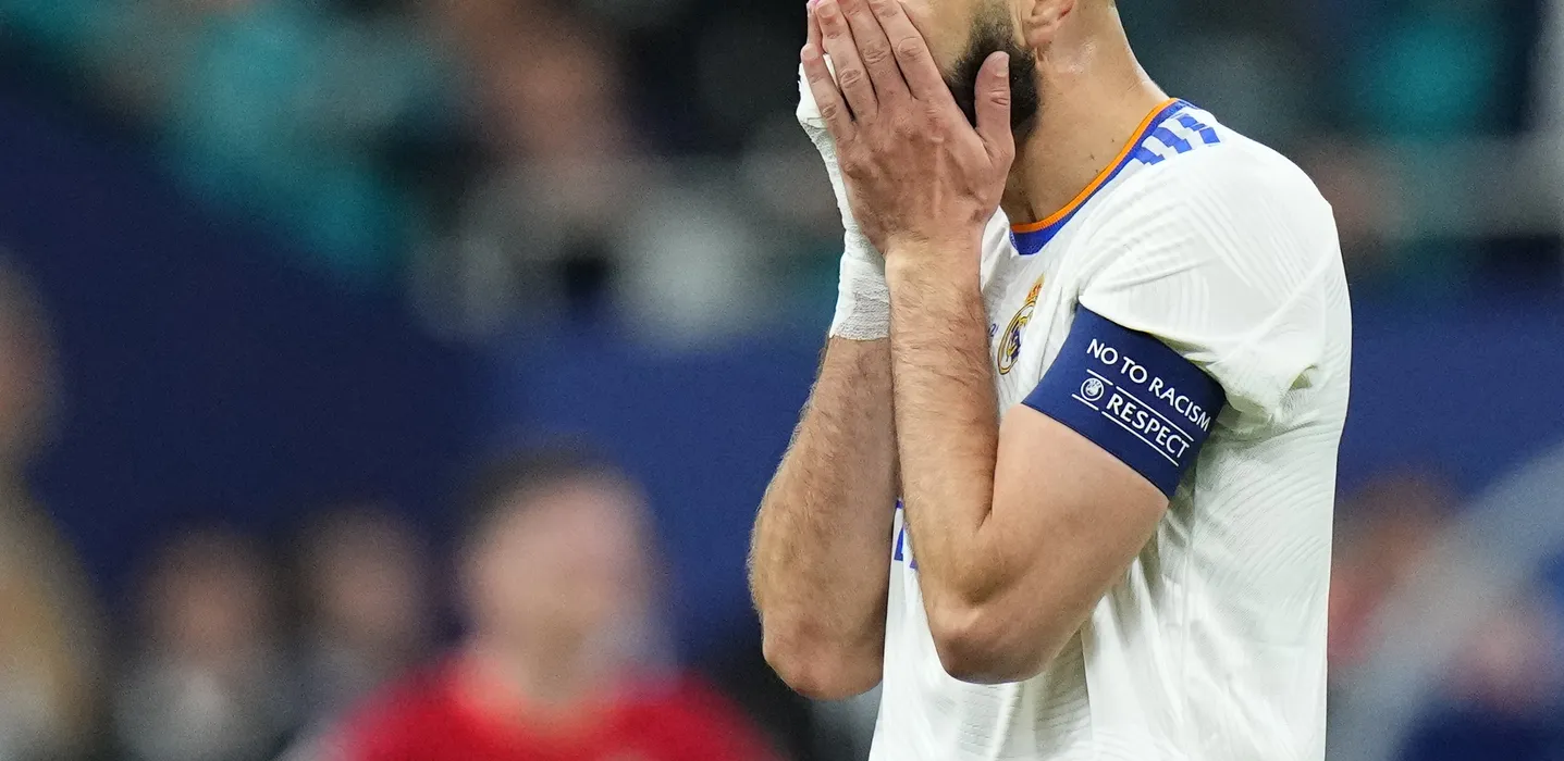 Real Madrid's Karim Benzema reacts after his goal was disallowed during the Champions League final soccer match between Liverpool and Real Madrid at the Stade de France in Saint Denis near Paris, Saturday, May 28, 2022. (AP Photo/Petr David Josek)