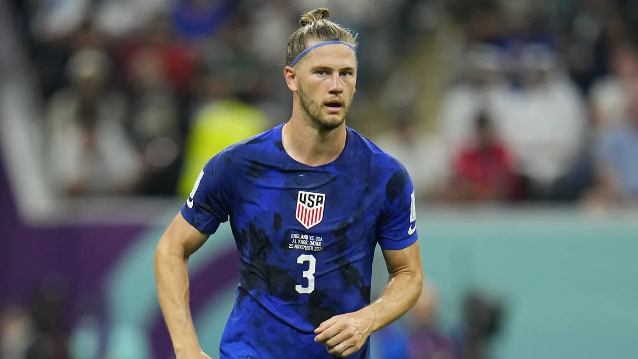 Walker Zimmerman of the United States in action during the World Cup group B soccer match between England and the United States, at the Al Bayt Stadium in Al Khor, Qatar, Friday, Nov. 25, 2022. (AP Photo/Julio Cortez)