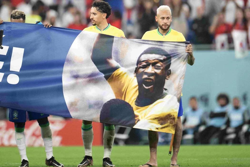 Neymar Jr and Marquinhos of Brazil hold a banner showing support for former Brazil player Pele after the FIFA World Cup Qatar 2022 Round of 16 match between Brazil v Korea Republic at Stadium 974, on December 05, 2022 in Doha, Qatar.