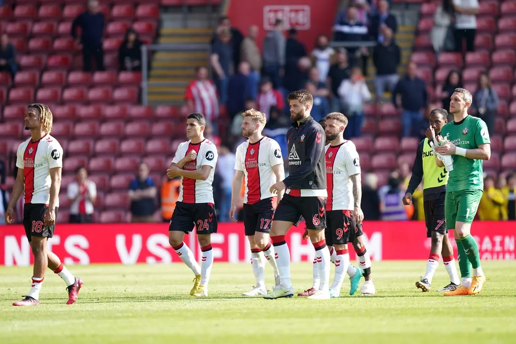 Southampton players react to relegation to the Sky Bet Championship following the Premier League match at St. Mary's Stadium, Southampton. Picture date: Saturday May 13, 2023.,Image: 775613175, License: Rights-managed, Restrictions: EDITORIAL USE ONLY No use with unauthorised audio, video, data, fixture lists, club/league logos or "live" services. Online in-match use limited to 120 images, no video emulation. No use in betting, games or single club/league/player publications., Model Release: no