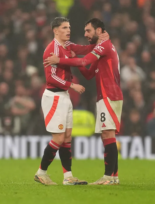 10 November 2024, United Kingdom, Manchester: Manchester United's Alejandro Garnacho (L) celebrates scoring his side's third goal with teammate Bruno Fernandes during the English Premier League soccer match between Manchester United and Leicester City at Old Trafford. Photo: Martin Rickett/PA Wire/dpa