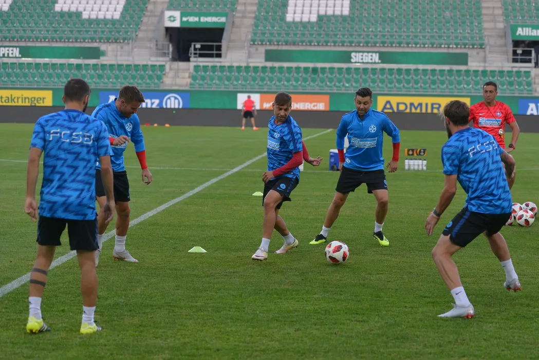 Alexandru Stan (CS) si Raul Rusescu (D), de la FC Steaua Bucuresti, participa la antrenamentul oficial inainte de meciul cu Rapid Viena din Play-off-ul Europa League, mmiercuri, 22 august 2018, in Viena.© FOTO:SPORT PICTURES