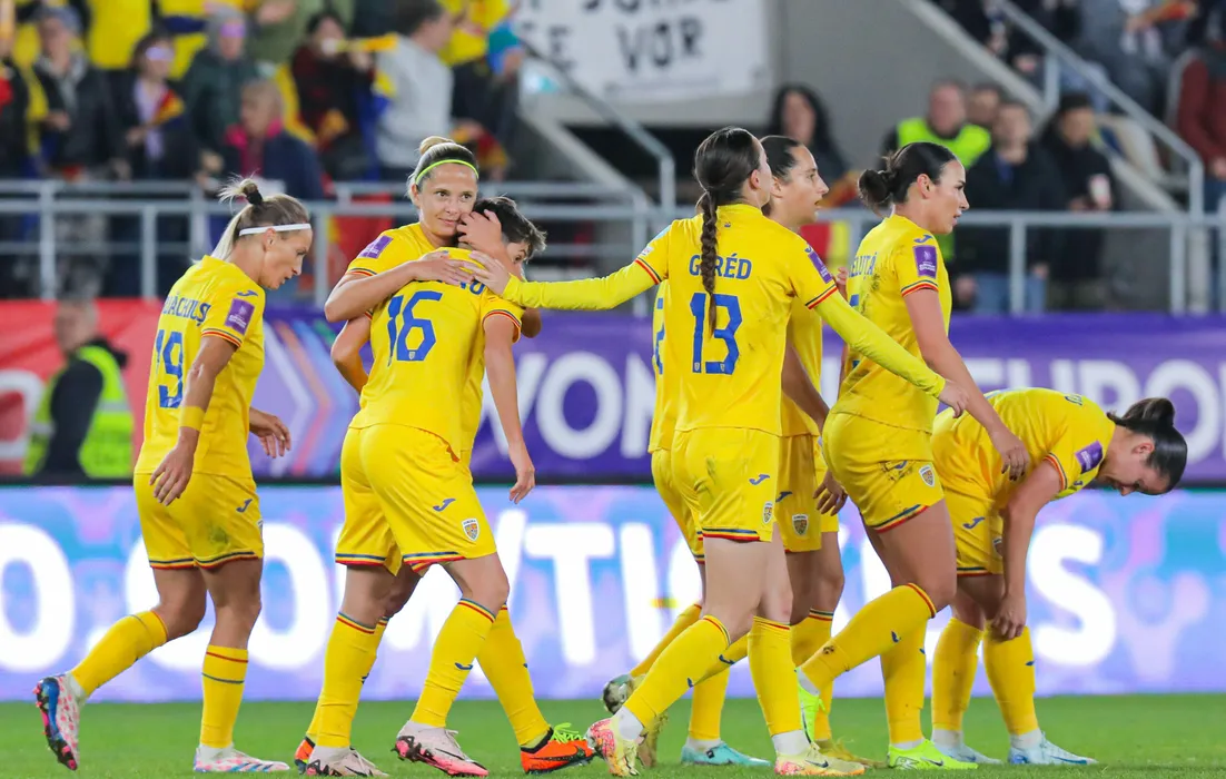 Fotbalistele românce se bucură după un gol marcat în meciul de fotbal feminin dintre România și Polonia, contand pentru Campionatul European de Fotbal Feminin 2025, desfasurat pe Stadionul Arcul de Triumf din Bucuresti, vineri 25 octombrie 2024. © FOTO: Mihai-Antonio VASILE/SPORT PICTURES