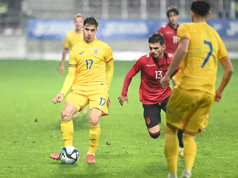 Paulo Buxhelaj si Marius Corbu in meciul de fotbal dintre Romania U21 si Albania U21, contand pentru Preliminariile EURO 2025, desfasurat pe Stadionul Superbet Arena Giulesti din Bucuresti, vineri 17 noiembrie 2023. © FOTO:Razvan Pasarica/SPORT PICTURES