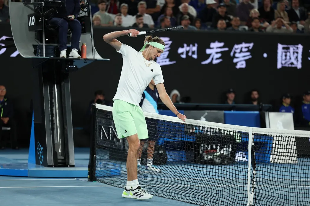 Germany's Alexander Zverev hits the net with his racquet while playing against Russia's Daniil Medvedev during their men's singles semi-final match on day 13 of the Australian Open tennis tournament in Melbourne on January 26, 2024.,Image: 840753388, License: Rights-managed, Restrictions: -- IMAGE RESTRICTED TO EDITORIAL USE - STRICTLY NO COMMERCIAL USE --, Model Release: no