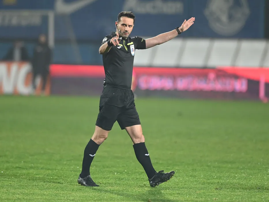 Arbitrul central Sebastian Coltescu reactioneaza in meciul de fotbal dintre Farul Constanta si CFR Cluj, contand pentru Cupa Romaniei Betano, desfasurat pe Stadionul central al Academiei Gheorghe Hagi din Ovidiu, miercuri 7 decembrie 2022. © FOTO:Razvan Pasarica/SPORT PICTURES