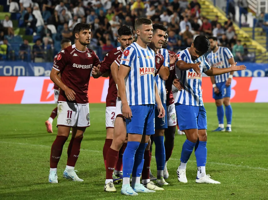 Guilherme Araujo Soarez, Florian Kamberi și Borisav Burmaz în meciul de fotbal dintre Poli Iași si FC Rapid 1923 București, contând pentru SuperLiga Superbet, desfășurat pe Stadionul Emil Alexandrescu din Iași, vineri 23 august 2024. © FOTO: Tudi/SPORT PICTURES