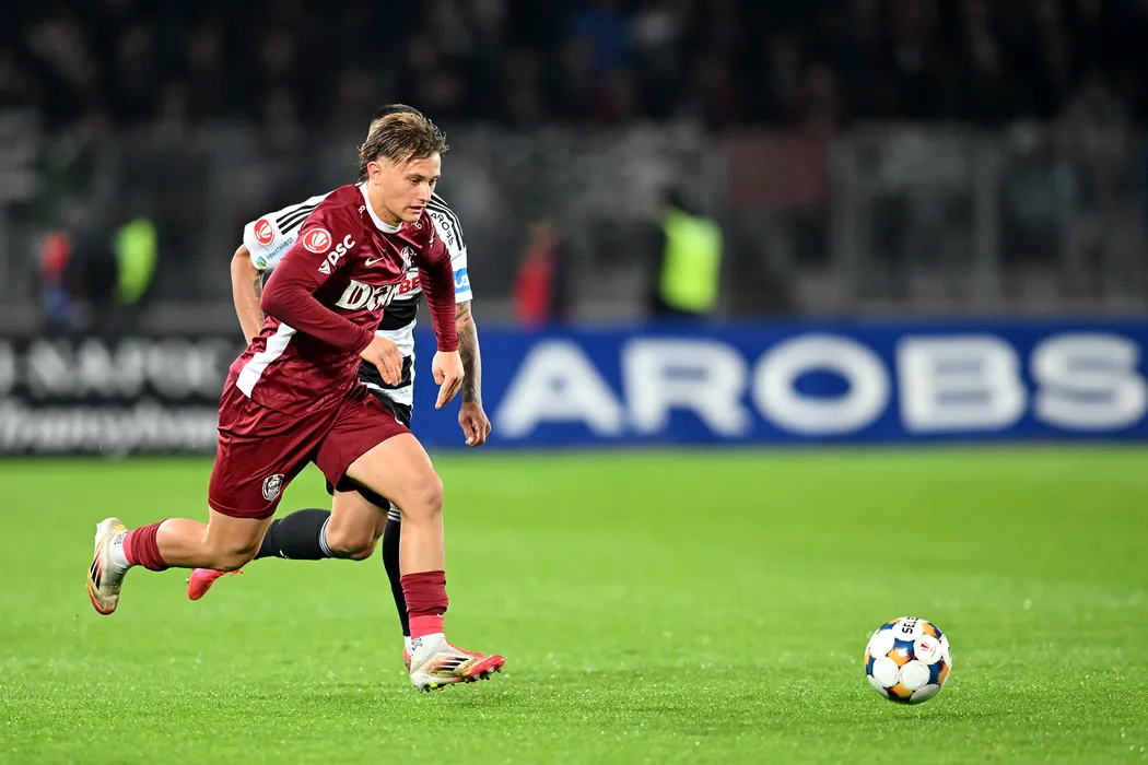 Lorenzo Biliboc, de la CFR Cluj, suteaza in timpul meciului de fotbal contra echipei Universitatea Cluj din etapa a XI-a a Superligii, disputat pe Cluj Arena din Cluj-Napoca, luni, 29 septembrie 2025. FLAVIU BUBOI / MEDIAFAX FOTO