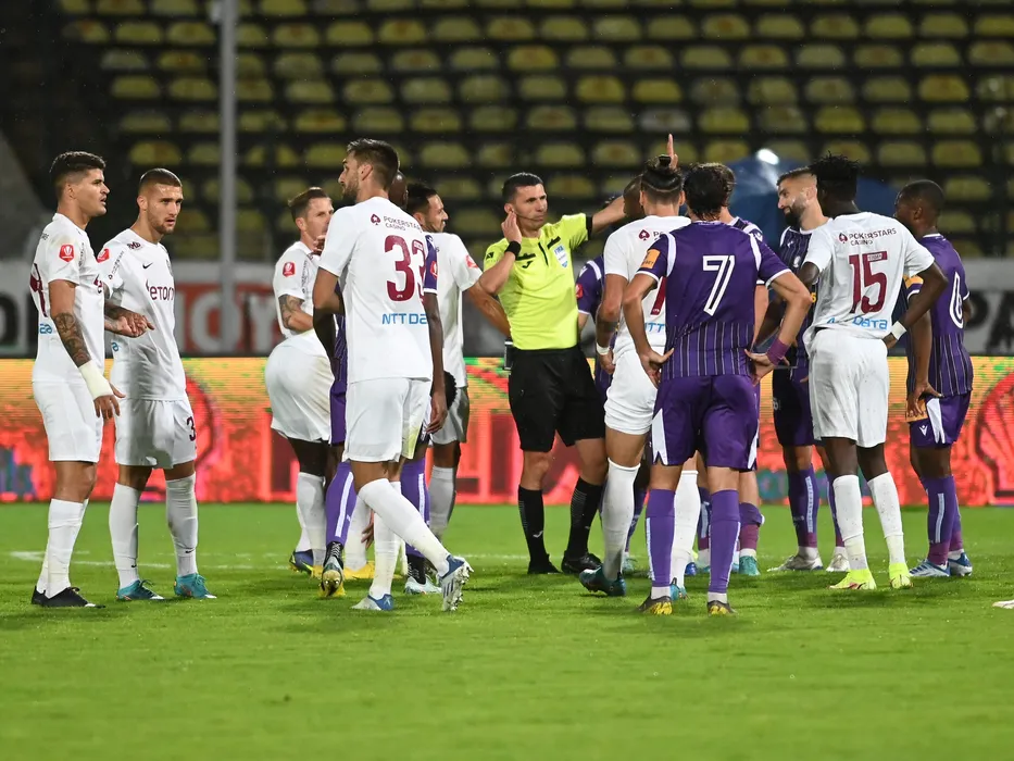 Arbitrul central Marcel Birsan alaturi de Jefferson Yuri De Sousa Matias, Denis Kolinger si Emmanuel Yeboah in meciul de fotbal dintre FC Arges si CFR Cluj, contand pentru Superliga Superbet, desfasurat pe Stadionul Nicolae Dobrin din Pitesti, luni 19 septembrie 2022. © FOTO:Razvan Pasarica/SPORT PICTURES