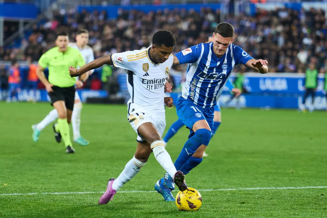 VITORIA-GASTEIZ, SPAIN - DECEMBER 21: m1 of Real Madrid duels for the ball with Rafa Marin of Deportivo Alaves during the LaLiga EA Sports match between Deportivo Alaves and Real Madrid CF at Estadio de Mendizorroza on December 21, 2023 in Vitoria-Gasteiz, Spain. (Photo by Juan Manuel Serrano Arce/Getty Images)