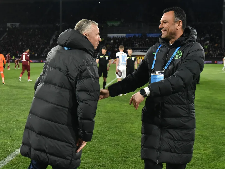 Cei doi antrenori Toni Petrea si Dan Petrescu se saluta inaintea meciului de fotbal dintre CFR Cluj si FCSB, contand pentru Play-off-ul Ligii 1 Casa Pariurilor, desfasurat pe Stadionul CFR Dr. Constantin Radulescu din Cluj Napoca, duminica 17 aprilie 2022. © FOTO:Razvan Pasarica/SPORT PICTURES