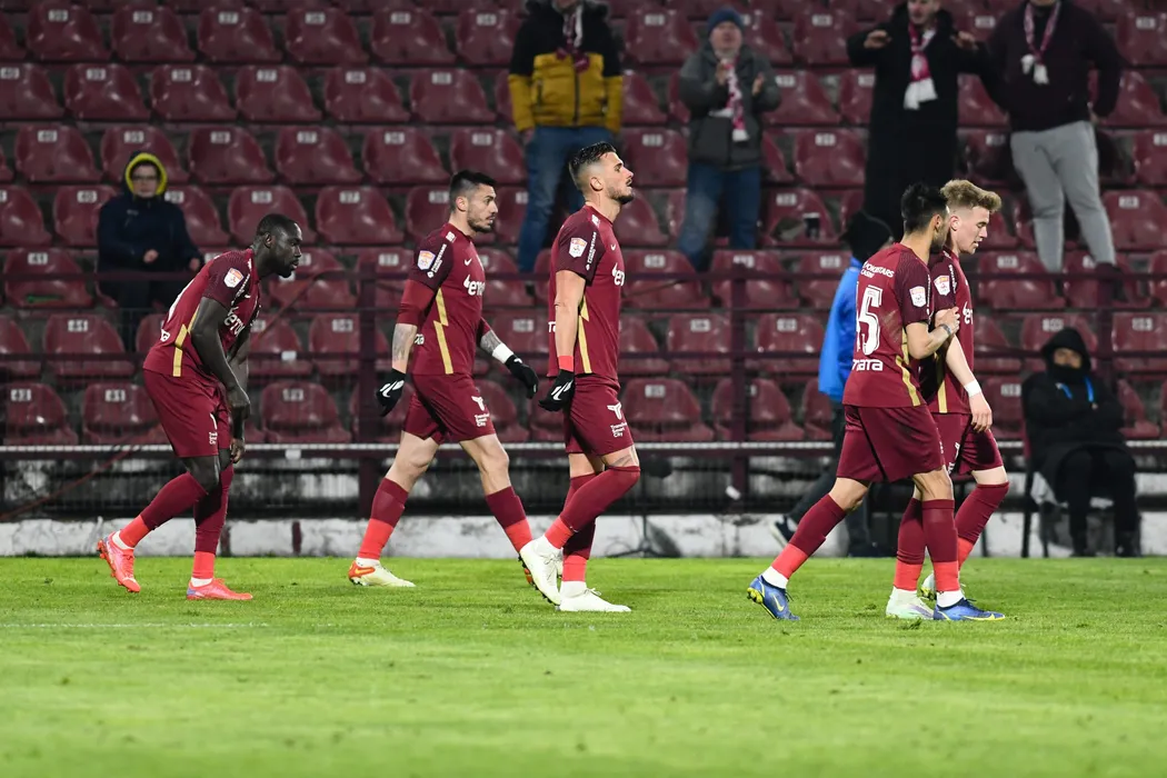 Jucatorii formatiei CFR Cluj reactioneaza dupa inscrierea unui gol in timpul meciului de fotbal contra echipei FC Arges din etapa a 3-a a play-off-ului Ligii 1, disputat pe stadionul Dr. Constantin Radulescu din Cluj-Napoca, luni, 4 aprilie 2022. FLAVIU BUBOI / MEDIAFAX FOTO