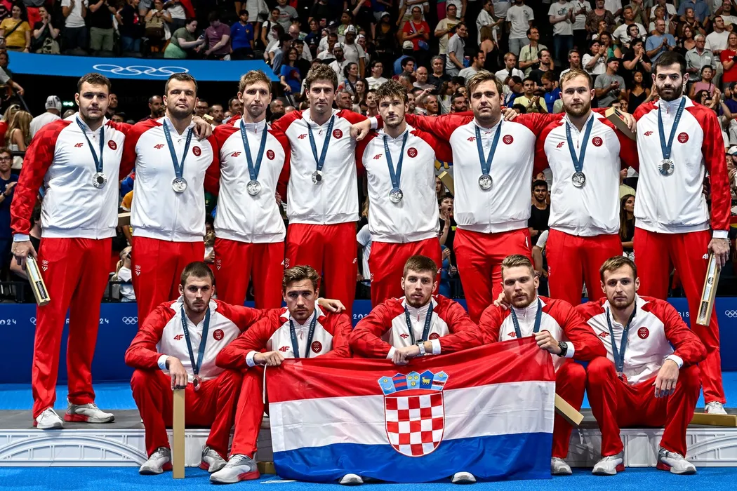 Athletes of team Croatia stand with the silver medal after competing in the water polo men gold medal match between team Serbia (white caps) and team Croatia (blue caps) of the Paris 2024 Olympic Games at La Defense Arena in Paris (France), August 11, 2024.