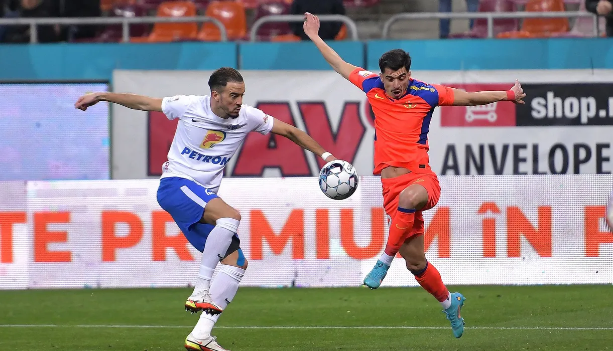 Damien Dylan Dussaut si Valentin Gheorghe in meciul de fotbal dintre FCSB si Farul Constanta, contand pentru Liga 1 Casa Pariurilor, desfasurat pe Arena Nationala din Bucuresti, duminica 27 februarie 2022. © FOTO:Razvan Pasarica/SPORT PICTURES