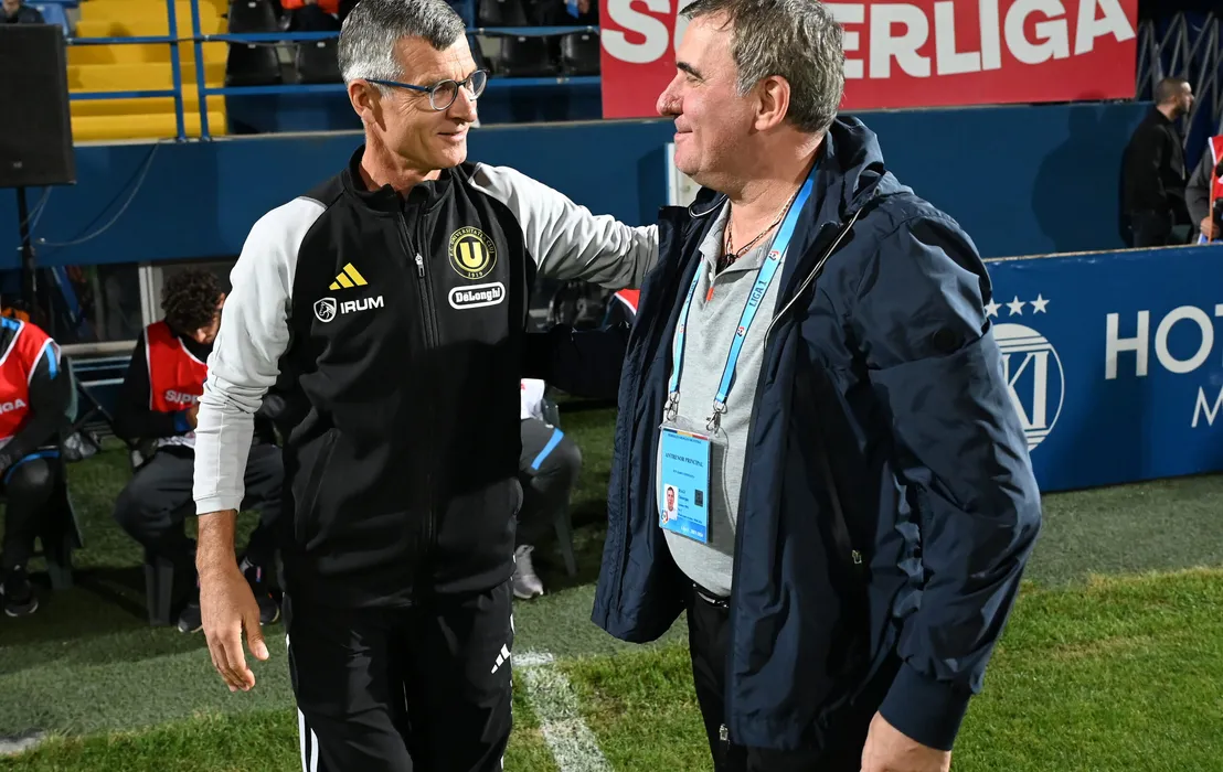 Cei doi antrenori Gheorghe Hagi si Ovidiu Ioan Sabau se saluta inaintea meciului de fotbal dintre Farul Constanta si Universitatea Cluj, contand pentru Superliga Superbet, desfasurat pe Stadionul central al Academiei Gheorghe Hagi din Ovidiu, sambata 21 octombrie 2023. © FOTO:Razvan Pasarica/SPORT PICTURES