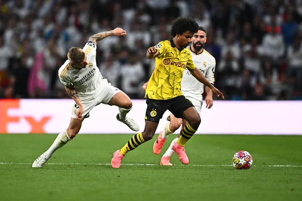 01 June 2024, United Kingdom, London: Dortmund's Karim Adeyemi in action against Madrid's Toni Kroos (L) and Dani Carvajal during the UEFA Champions League final soccer match between Borussia Dortmund and Real Madrid CF at Wembley Stadium. Photo: Tom Weller/dpa