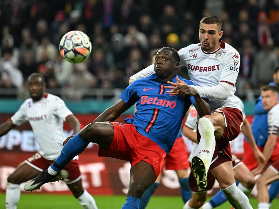 Joyskim Aurelien Dawa Tchakonte si Denis Ciobotariu in meciul de fotbal dintre FCSB si Rapid Bucuresti, contand pentru Play off-ul Superligii Superbet, desfasurat pe Arena Nationala din Bucuresti, duminica 16 martie 2025. © FOTO:Razvan Pasarica/SPORT PICTURES