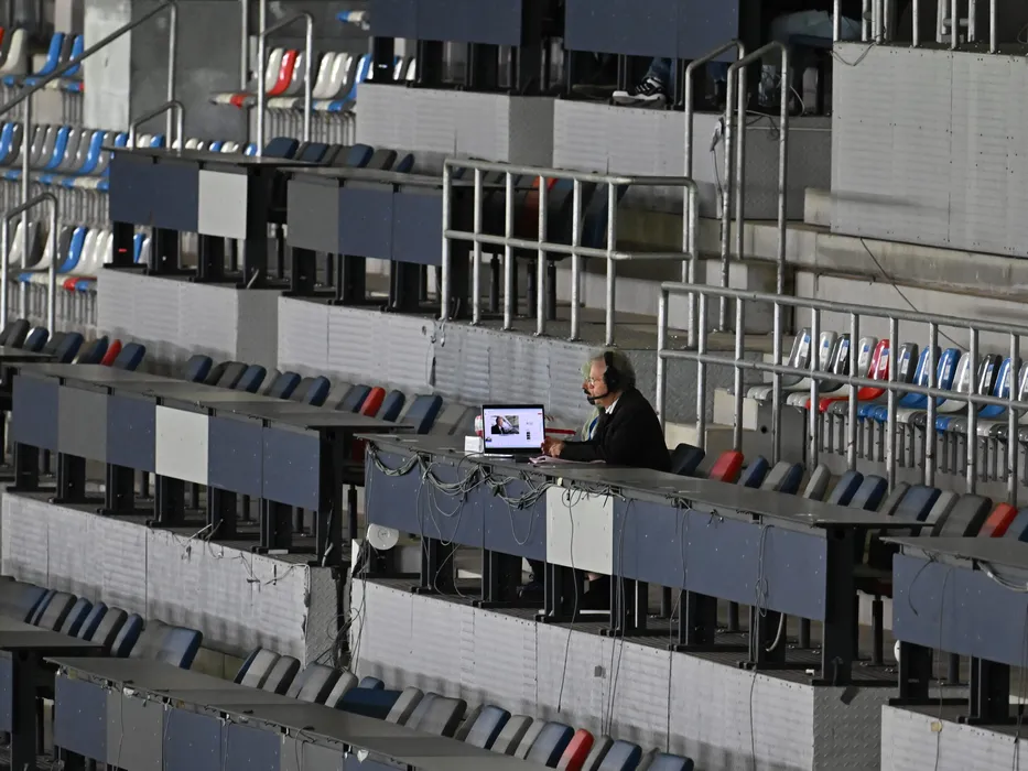 Celebrul comentator radio, Ilie Dobre, aproape singur la masa presei la meciul de fotbal dintre Steaua Bucuresti si Concordia Chiajna, contand pentru Liga a-2-a Casa Pariurilor, desfasurat pe Stadionul Steaua-Ghencea din Bucuresti, joi 17 octombrie 2024. © FOTO:Razvan Pasarica/SPORT PICTURES