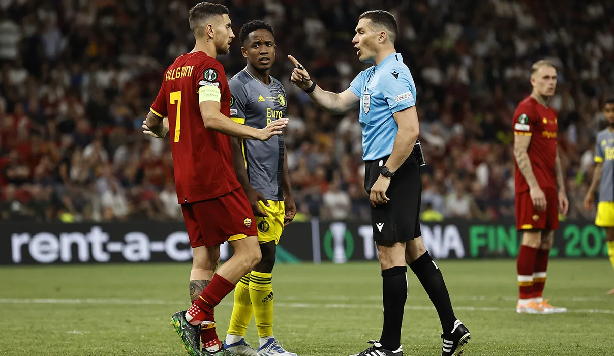TIRANA - (lr) Lorenzo Pellegrini of AS Roma, Luis Sinisterra of Feyenoord, referee Istvan Kovacs during the UEFA Conference League Final match between AS Roma and Feyenoord at Arena Kombetare on May 25, 2022 in Tirana, Albania. ANP MAURICE VAN STEEN (Photo by ANP via Getty Images)