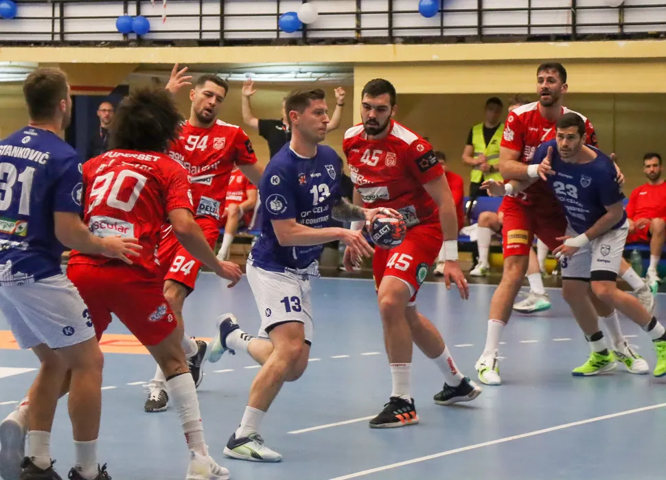 Mikalai Aliokhin și Rosta Miklos în meciul de handbal masculin dintre CSM Constanța si CS Dinamo București, contând pentru EHF European League, desfășurat în Sala Simona Amânar Sports Hall din Constanța, marți 27 februarie 2024. © FOTO: Sorin DANIELCIUC/SPORT PICTURES