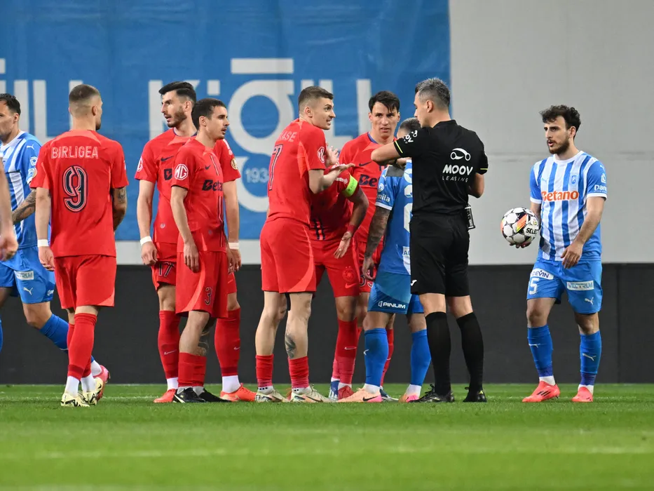Arbitrul central Horatiu Mircea Fesnic discută cu fotbaliștii ros-albastrii George Daniel Bîrligea, Mihai Popescu, Juri Cisotti, Florin Lucian Tănase si Risto Radunovic sub privirile lui Anzor Mekvabishvili cu mingea in mana la meciul dintre Universitatea Craiova si FCSB, contand pentru Play off-ul Superligii Superbet, desfasurat pe Stadionul Ion Oblemenco din Craiova, duminica 13 aprilie 2025. © FOTO:Razvan Pasarica/SPORT PICTURES