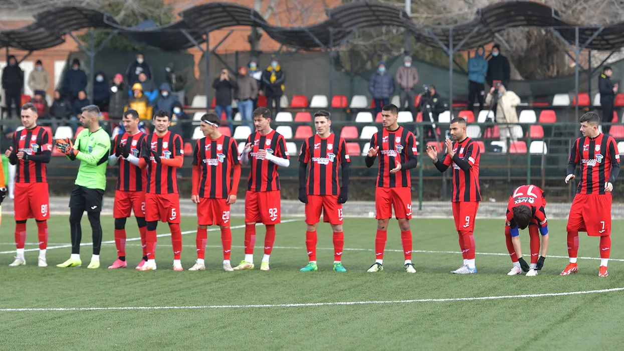 Fotbalistii giurgiuveni la startul meciului amical de fotbal dintre Petrolul Ploiesti si Astra Giurgiu, desfasurat pe terenul sintetic din Campina, sambata 22 ianuarie 2022. © FOTO:Razvan Pasarica/SPORT PICTURES