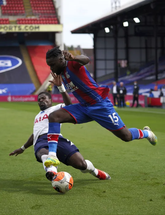 26 July 2020, England, London: Tottenham Hotspur's Serge Aurier (L) and Crystal Palace's Jeffrey Schlupp battle for the ball during the English Premier League soccer match between Crystal Palace and Tottenham Hotspur at the Emirates Stadium. Photo: Will Oliver/PA Wire/dpa