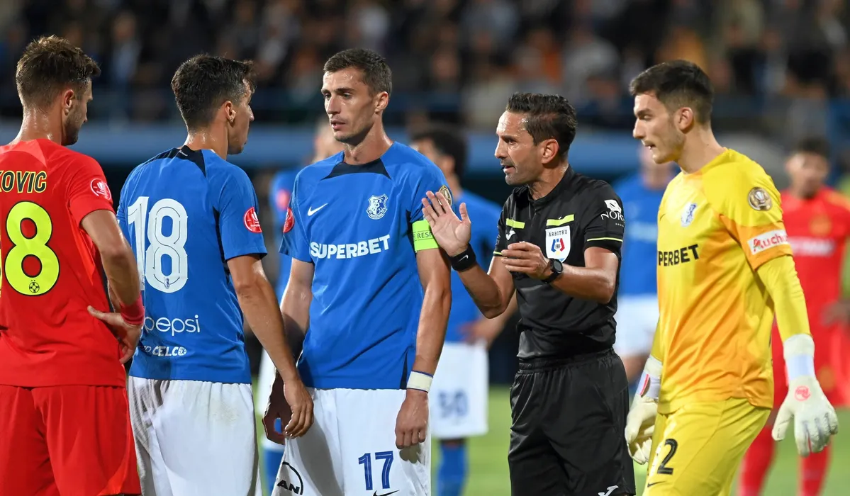 Arbitrul central Sebastian Coltescu discuta cu Adrian Gheorghe Sut, Andrei Viorel Artean, Ionut Justinian Larie si Marian Mihai Aioani in meciul de fotbal dintre Farul Constanta si FCSB, contand pentru Superliga Superbet, desfasurat pe Stadionul central al Academiei Gheorghe Hagi din Ovidiu, duminica 17 septembrie 2023. © FOTO:Razvan Pasarica/SPORT PICTURES