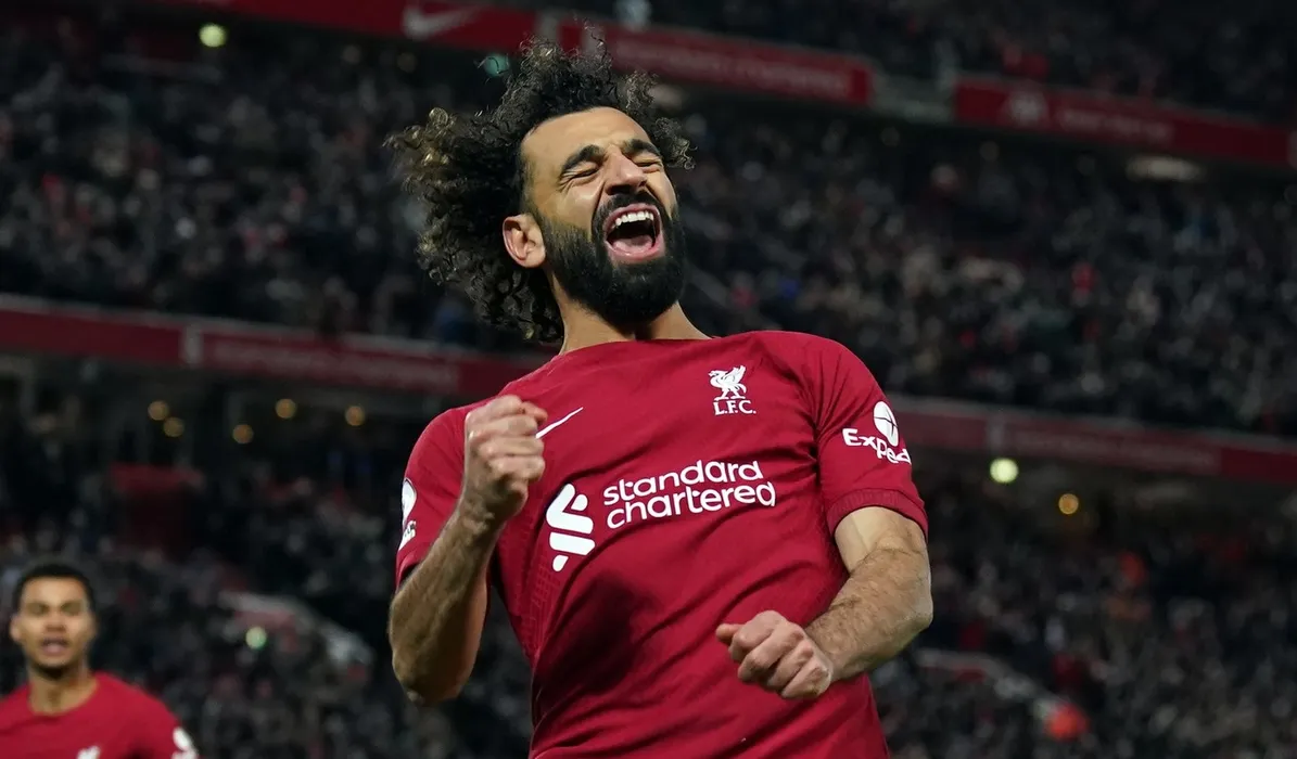 Liverpool's Mohamed Salah celebrates scoring his sides second goal during the Premier League match at Anfield, Liverpool. Picture date: Wednesday March 1, 2023.,Image: 759603930, License: Rights-managed, Restrictions: EDITORIAL USE ONLY No use with unauthorised audio, video, data, fixture lists, club/league logos or "live" services. Online in-match use limited to 120 images, no video emulation. No use in betting, games or single club/league/player publications., Model Release: no