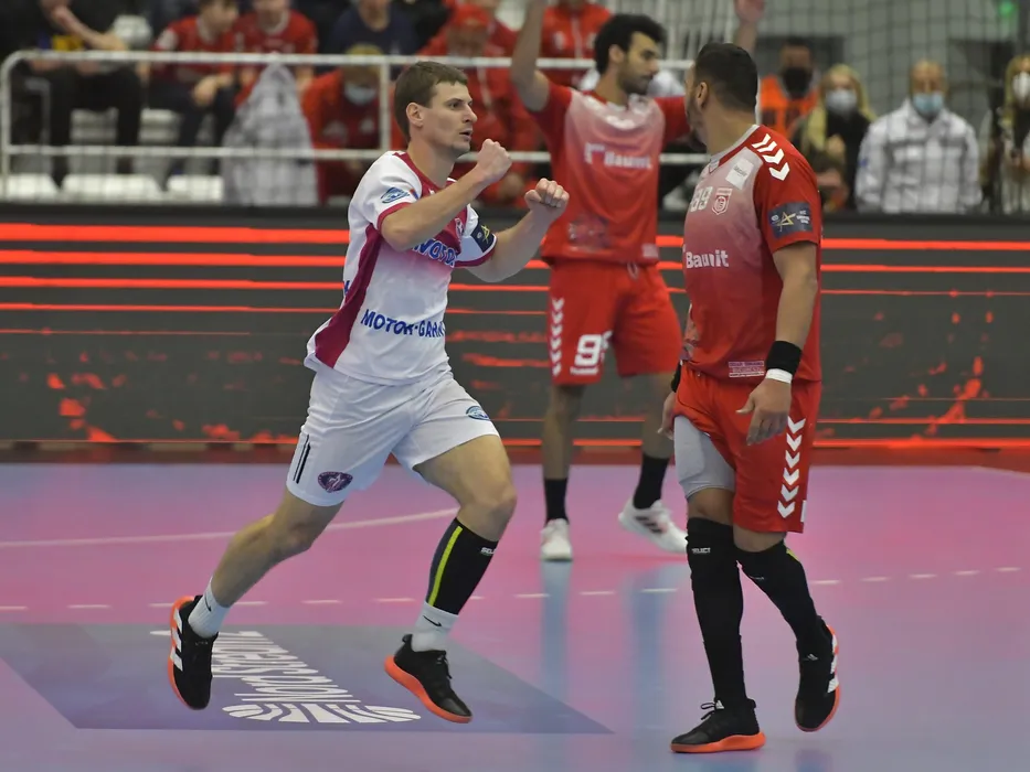 Un handbalist ucrainian se bucura dupa un gol marcat in meciul de handbal masculin dintre Dinamo Bucuresti si HC Motor Zaporozhye, contand pentru Liga Campionilor, desfasurat in Sala Dinamo din Bucuresti, joi 9 decembrie 2021. © FOTO:Razvan Pasarica/SPORT PICTURES