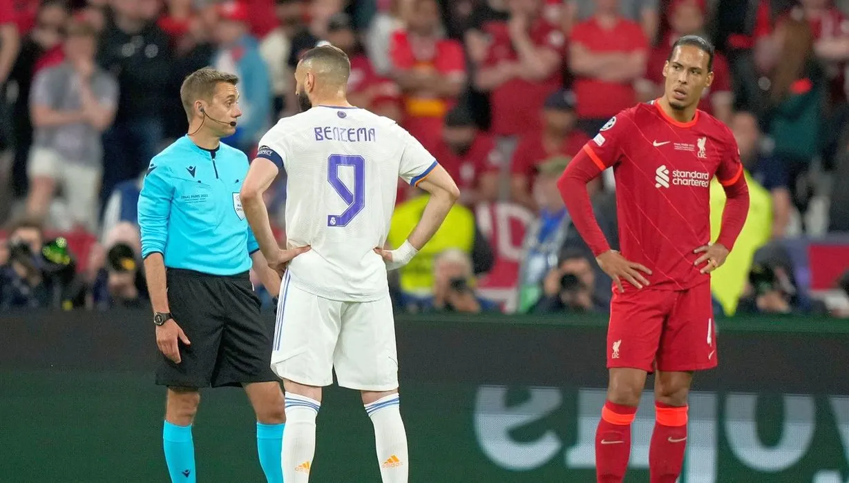 Karim Benzema of Real Madrid (9) talks with Referee Clement Turpin about a non-goal decision