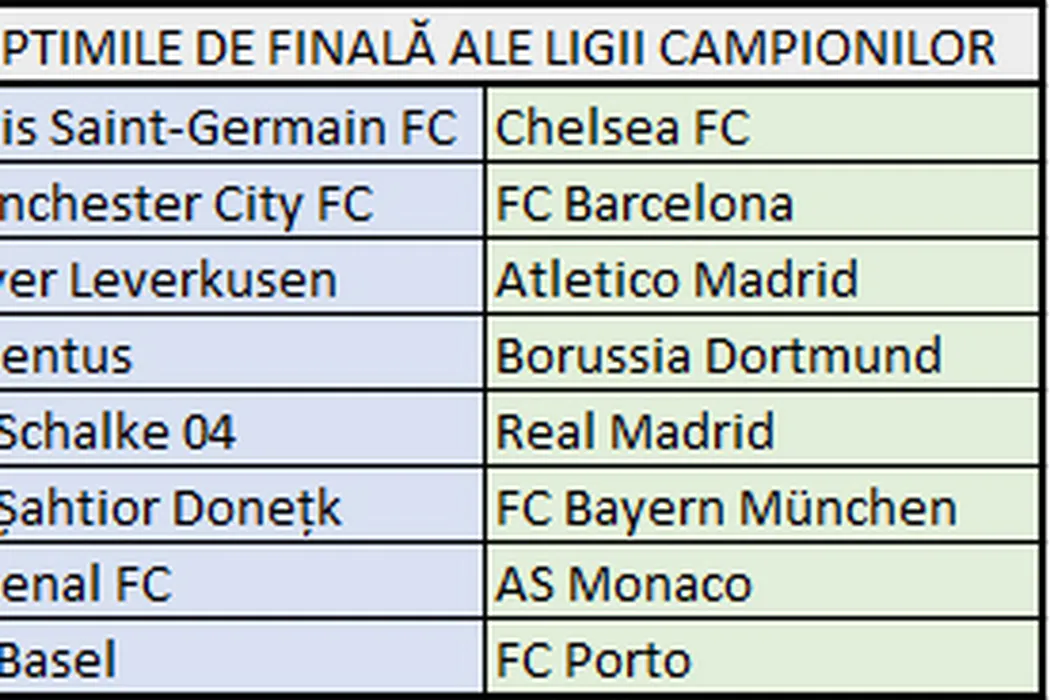 S-au tras la sorți optimile de finală din Liga Campionilor: PSG – Chelsea, City – Barcelona, Șahtior – Bayern. Duel românesc în șaisprezecimile Europa League: Spurs – Fiorentina. Toate meciurile