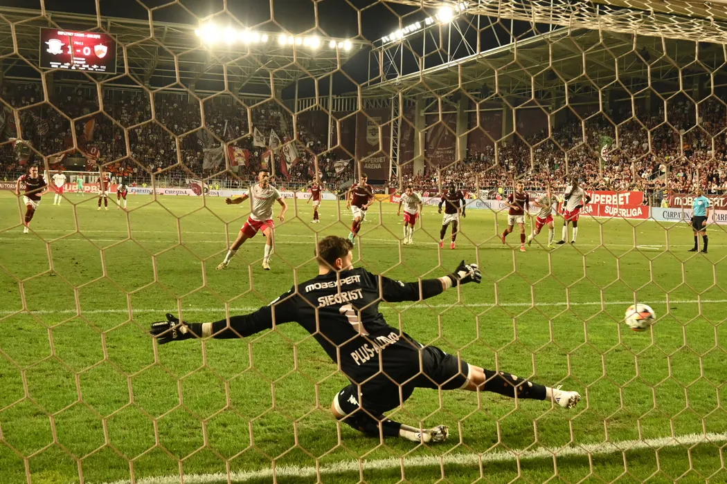 Selmani Astrit marchează un gol din penalty în poarta lui Benjamin Kevin Siegrist in meciul de fotbal dintre Rapid Bucuresti si Dinamo Bucuresti, din cadrul Superligii Superbet, desfasurat pe Superbet Arena-Giulesti din Bucuresti, duminica 18 august 2024. © FOTO:Razvan Pasarica/SPORT PICTURES