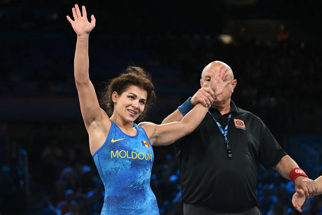 Moldova's Anastasia Nichita is annnounced as winner over Germany's Sandra Paruszewski in their women's freestyle 57kg wrestling early rounds match at the Champ-de-Mars Arena during the Paris 2024 Olympic Games, in Paris on August 8, 2024.,Image: 897025270, License: Rights-managed, Restrictions: , Model Release: no