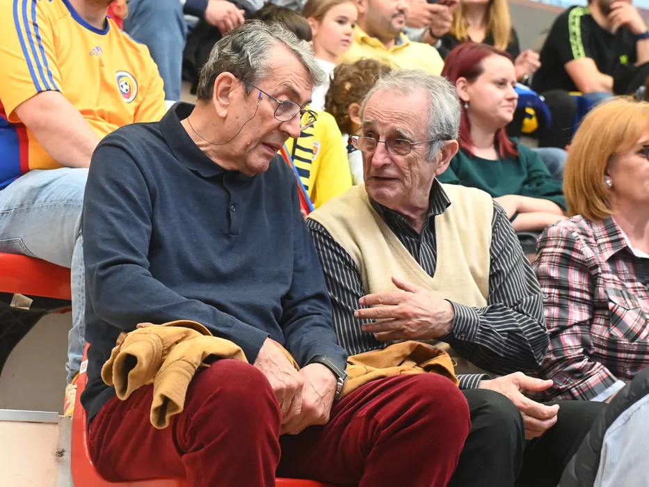 Valentin Samungi si Cristian Gatu discuta in tribuna la meciul de handbal masculin dintre Romania si Austria, din cadrul preliminariilor EHF Euro 2024, desfasurat in Sala Dinamo din Bucuresti, miercuri 26 aprilie 2023. © FOTO:Razvan Pasarica/SPORT PICTURES